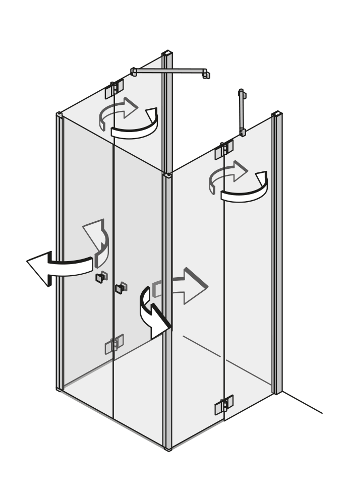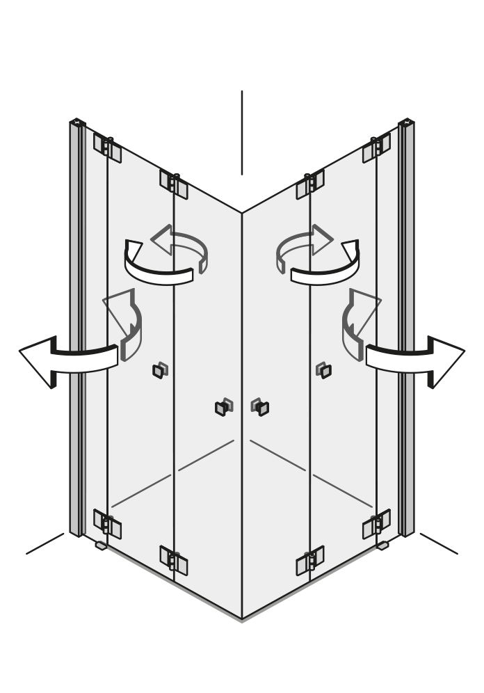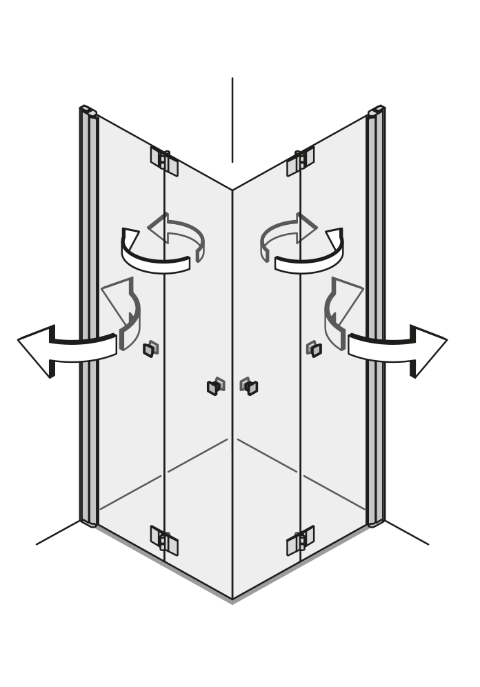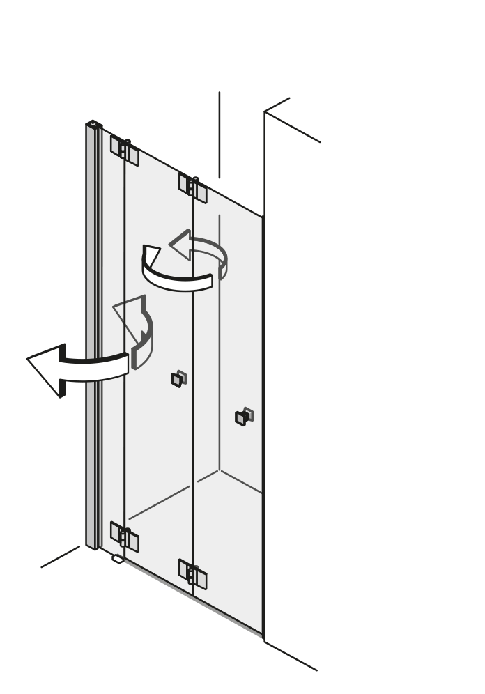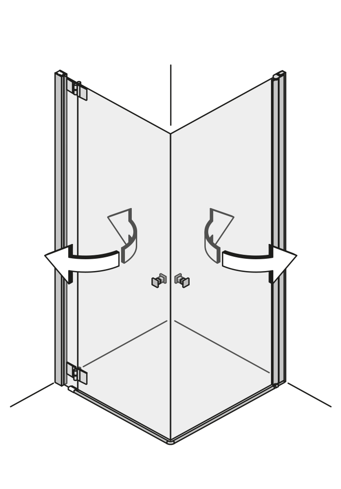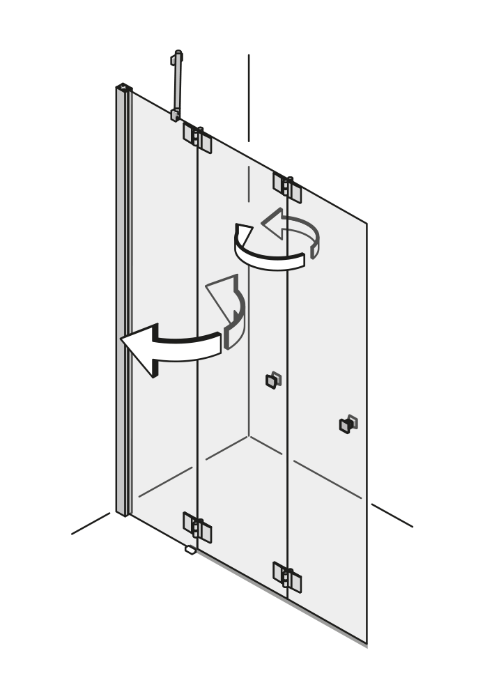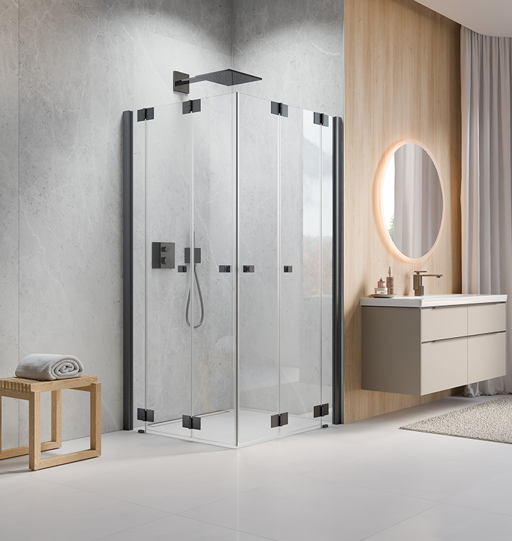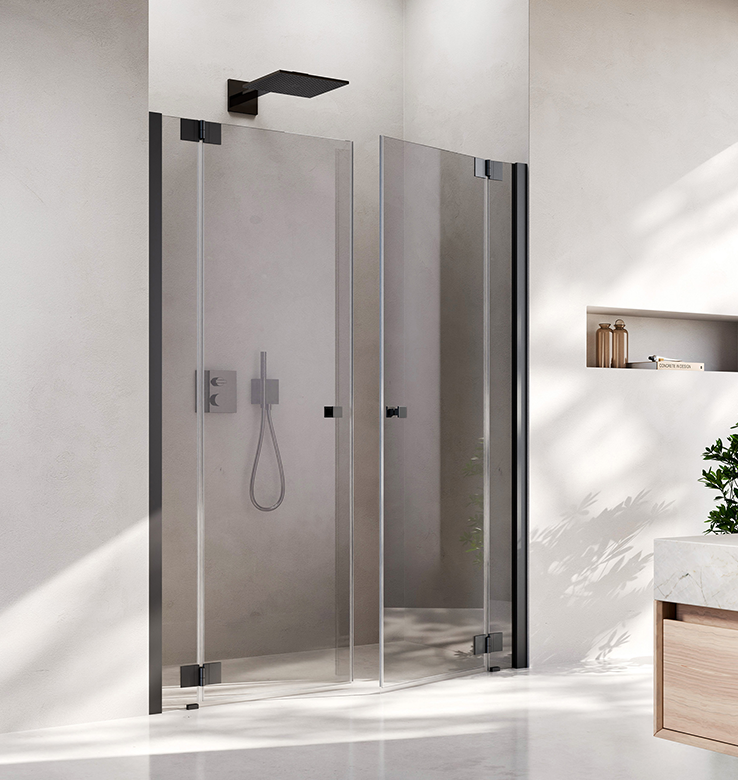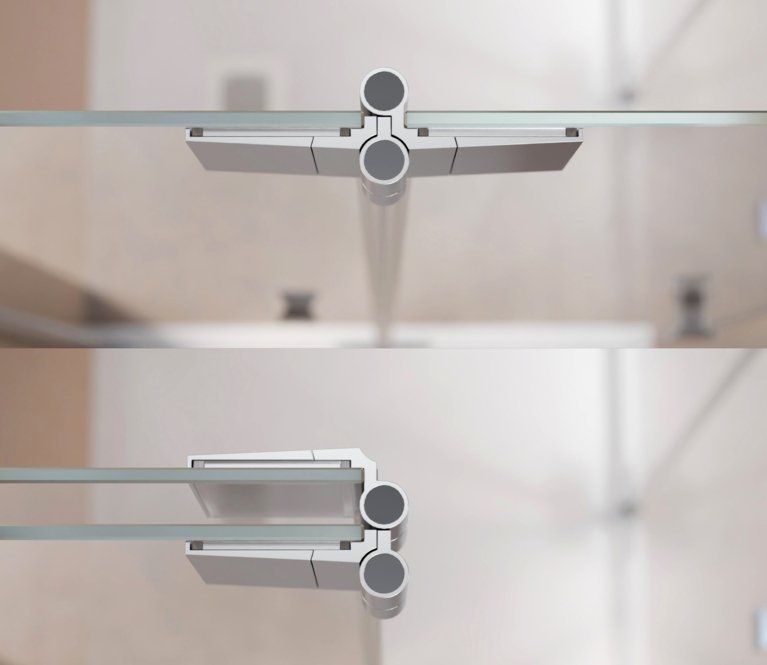 Durch die 360 ° Scharniere lässt sich jede Türfläche nach innen und außen falten – ideal für kleine Bäder oder schmale Nischen. Das einzigartige 360 ° TWIN-Scharnier bringt freien Raum in jedes Bad. Nach dem Duschen lassen sich die Wände einfach wegfalten.