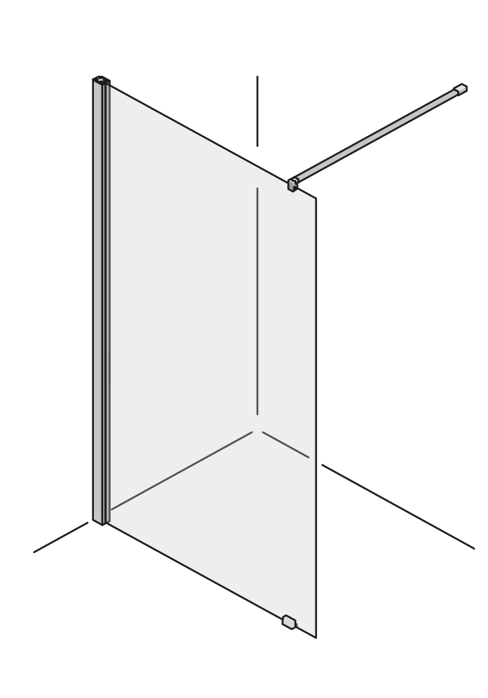 Offene Duschlösung mit voller Transparenz. Wahlweise mit durchgehendem Wandprofil oder geklebten Wandwinkeln. Optional mit Anhaltestange oder Spritzschutz-Flügel.Teilgerahmt