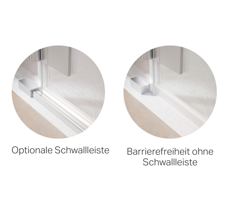 | Sie entscheiden : Für normgerechten Spritzschutz kann eine dezente, nur 12 mm hohe Schwallleiste in Türbereich gesetzt werden. Für maximale Barrierefreihit kann man auf die Montage der Schwallleiste verzichten. Eine spezielle Dichtleiste an der Tür sorgt dann für ausreichend Dichtheit. |