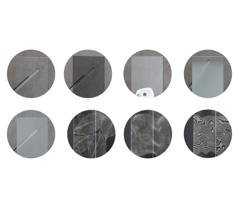 1. Glas hell, 2. Farbglas grau, 3. Mirror Soft, 4. Satinstreifen, 5. Satin, 6. Dekor 1, 7. Dekor 2, 8. Dekor 3